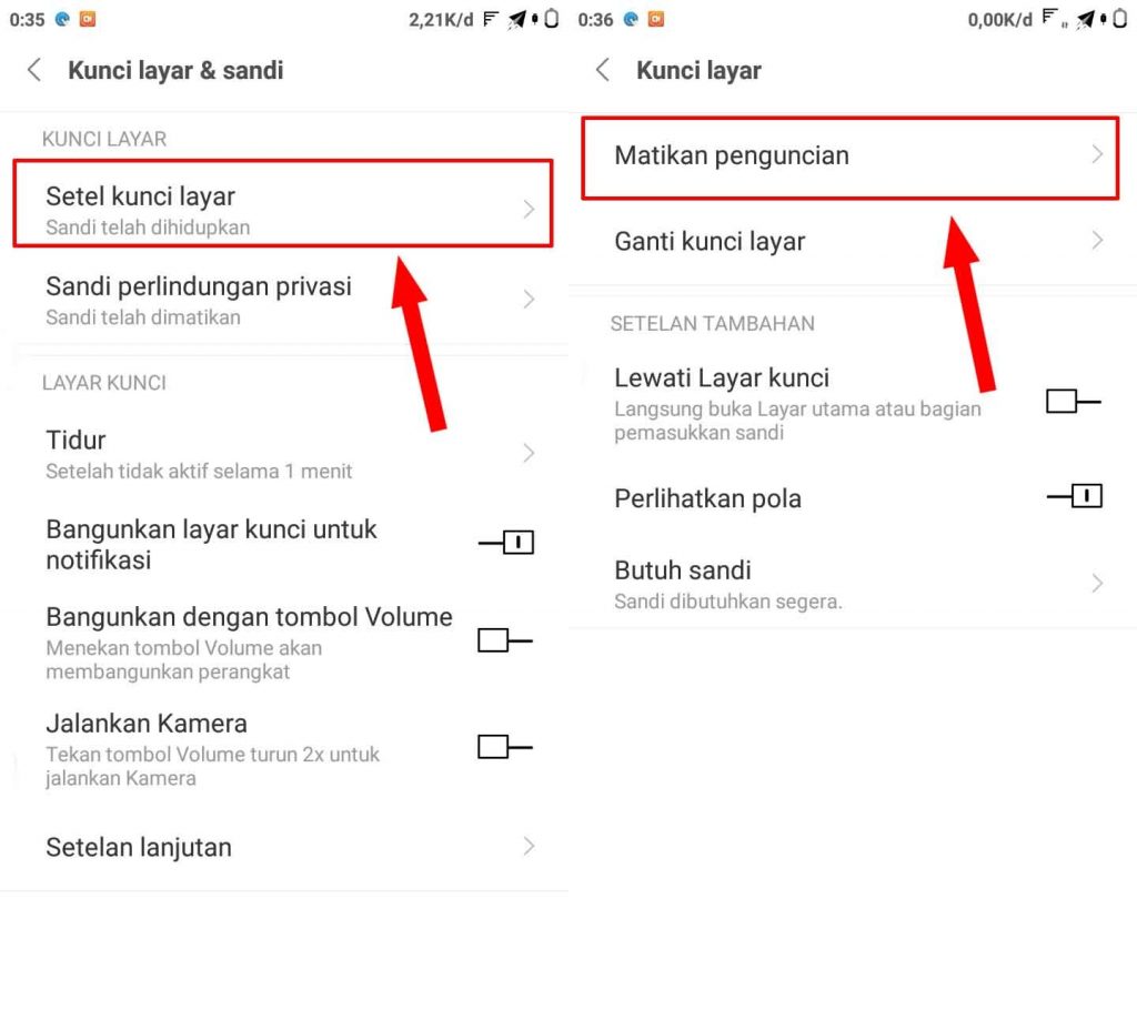 3. Selanjutnya tap Setel kunci layar kemudian tap Matikan penguncian untuk mematikan pengunci bawaan yang ada di smartphone kita.