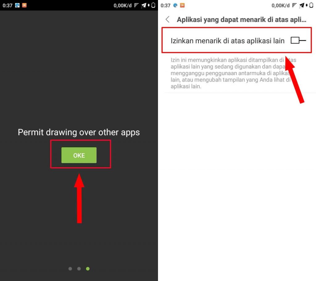 6. Tap OKE pada Permit drawing over other apps kemudian tap lagi pada Izinkan menarik di atas aplikasi lain.