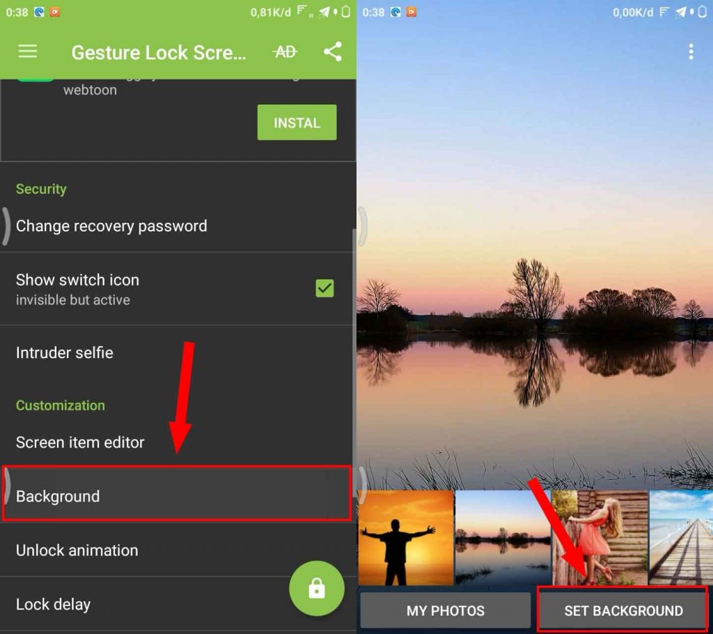 8. Tap Background untuk mengganti background pada layar kunci. Kamu bisa menambahkan photo atau gambar kamu sendiri dengan tap MY PHOTOS jika sudah tap SET BACKGROUND.