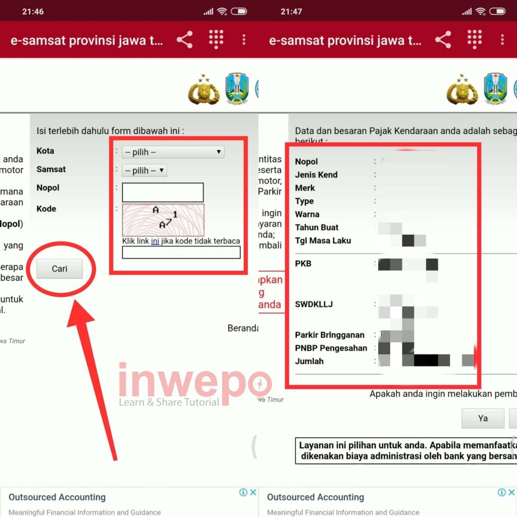 3. Pilih kota dimana kamu tinggal lalu samsat yang sama dengan kota kamu. Masukkan nomor polisi kendaraan kamu yang pada kolom yang sudah disediakan lalu masukkan kode dan tap menu cari. Jika sudah secara otomatis akan keluar keterangan biaya pajak kendaraan dan lain-lain.