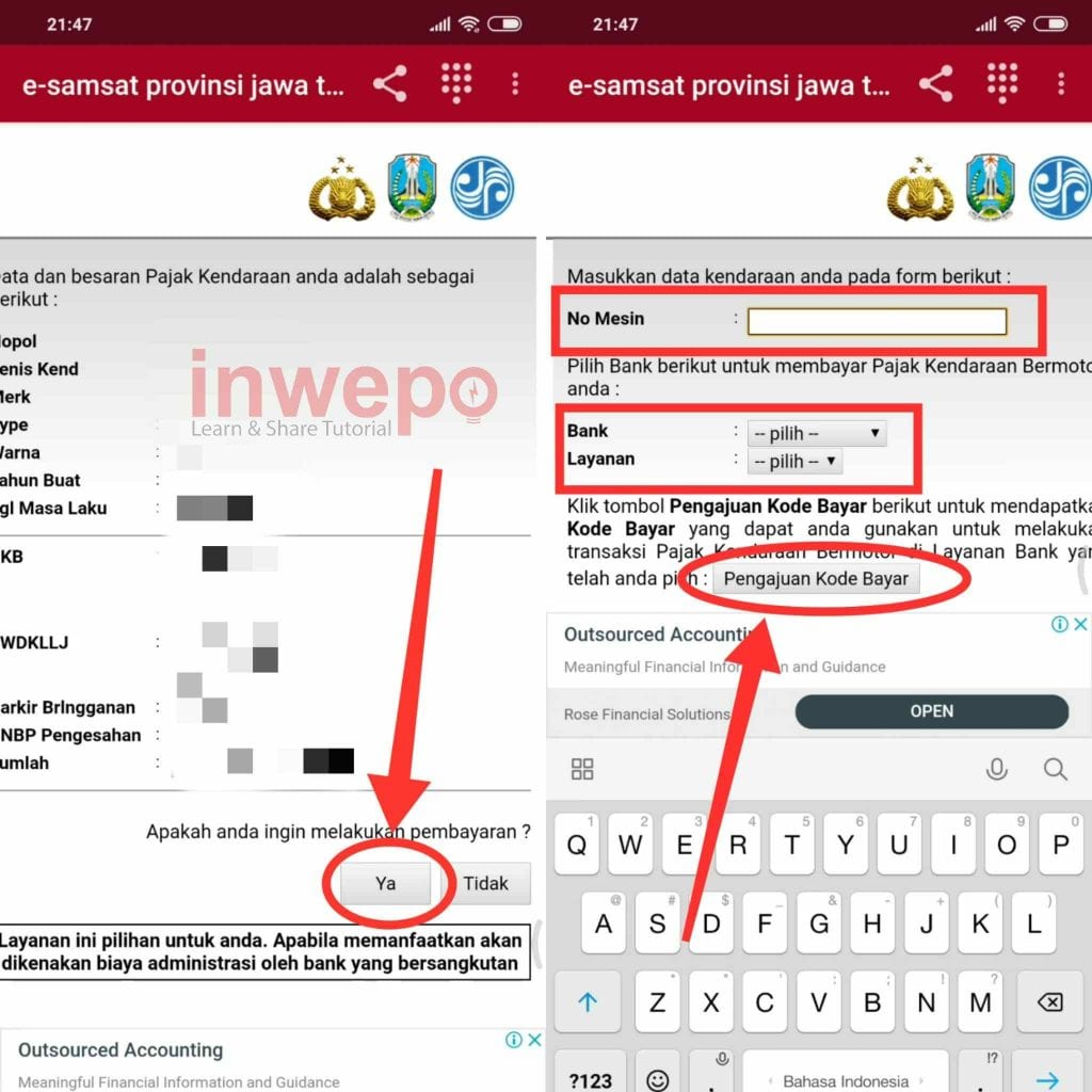 4. Tap menu ya di bagian bawah untuk melakukan pembayaran. Masukkan Nomor Mesin kendaraan kamu pada kolom yang sudah disediakan. Selanjutnya pilih Bank yang kamu gunakan lalu pilih juga layanan yang digunakan bisa ATM atau Teller. Terakhir tap menu Pengajuan kode bayar, untuk mendapatkan kode pembayaran pajak dan lakukan pembayaran sesuai bank dan layanan yang kamu pilih.