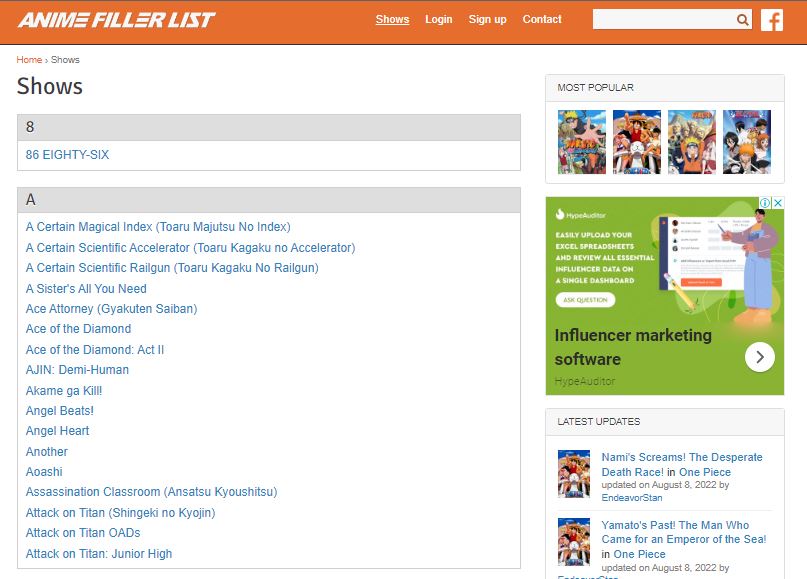 Belum lagi, jika tampilan visualisasi data atau penyajian informasinya yang kurang enak untuk dilihat. Pada akhirnya jika kamu ingin melihat episode filler dari anime lain, kamu harus lakukan pencarian ulang di Google. Ada cara yang lebih praktis, yakni dengan gunakan website animefillerlist.com. Ini adalah website yang mampu memberikan kamu daftar lengkap dari episode filler anime tertentu. Ada banyak anime yang bisa kamu temukan di dalamnya. Mulai dari huruf A-Z, mulai dari yang populer hingga yang kurang populer sekalipun. Tampilannya juga lebih mudah untuk dimengerti.