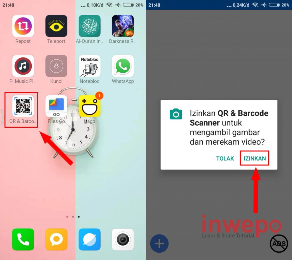 2. Buka aplikasi QR & Barcode Scanner kemudian beri izin pada aplikasi untuk mengambil gambar dari perangkat dengan tap IZINKAN.