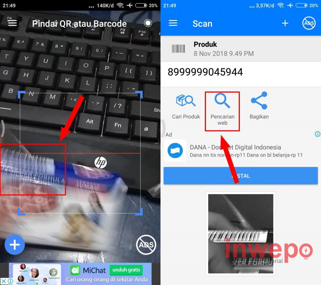 3. Langsung arahkan barang yang ingin kamu ketahui harga pasarannya ke kamera (pastikan agar barcode di barang terlihat oleh kamera). Setelah terscan dengan baik tap menu Pencarian Web.