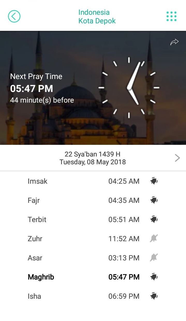 Untuk dapat mengakses fitur ini kamu harus terlebih dahulu mensetting lokasi tempat kamu berada. Hal ini dikarenakan akan berpengaruh terhadap waktu datangnya sholat dan imsak yang berbeda-beda disetiap wilayah. Selain itu kamu juga bisa menghidupkan suara Adzan waktu datangnya sholat, sehingga kamu Insyaallah ibadahnya bisa tepat waktu.
