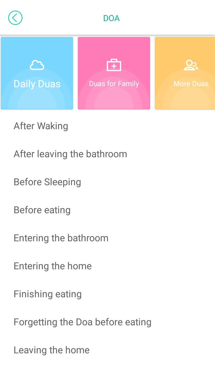 Fitur ini berisi kumpulan doa-doa sehari-hari seperti doa bangun tidur, mau makan, dll. Doa untuk keluarga seperti doa perlindungan kepada anak, untuk pengantin baru, ketika sangat sedih, dll. Selain itu juga adanya doa agar bisa melunasi hutang, meminta hujan, dll.