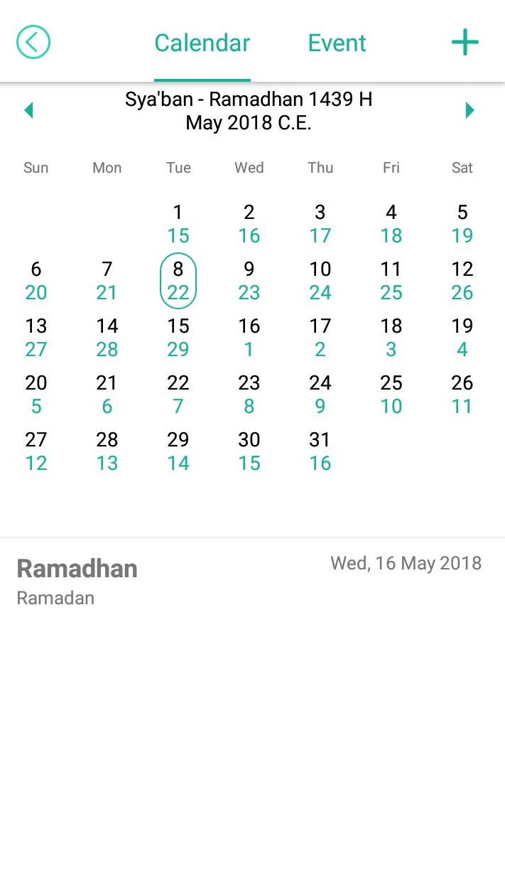 Fitur ini merupkan kalender islam, seperti yang diketahui bahwa kalender masehi berbeda dengan kalender hijriah. Oleh sebab itu dengan adanya fitur ini akan membantu kamu untuk mengetahui tanggal dimulainya puasa ramadhan. Kamu juga bisa menambahkan event pada kalender tersebut – cukup Tap icon +