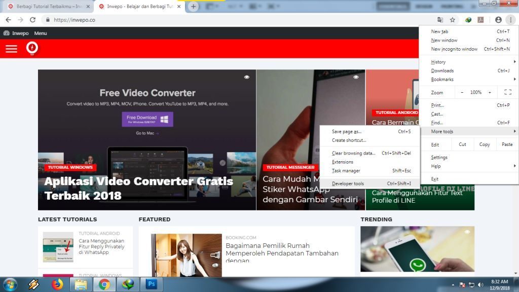 3. Klik ikon titik tiga di pojok kanan – Klik More tools – Klik Developer tools. Atau kamu juga bisa membuka Developer tools dengan keyboard yaitu tekan F12 atau tekan CTRL + SHIFT + I secara bersamaan.