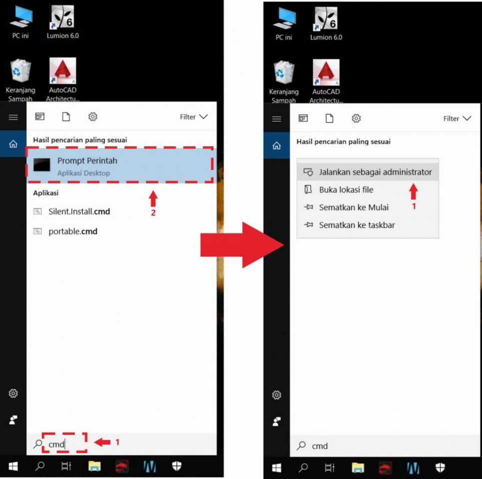 Catatan: Dalam membuka command prompt, harus melalui Administrator agar pengecekan dapat dilakukan.