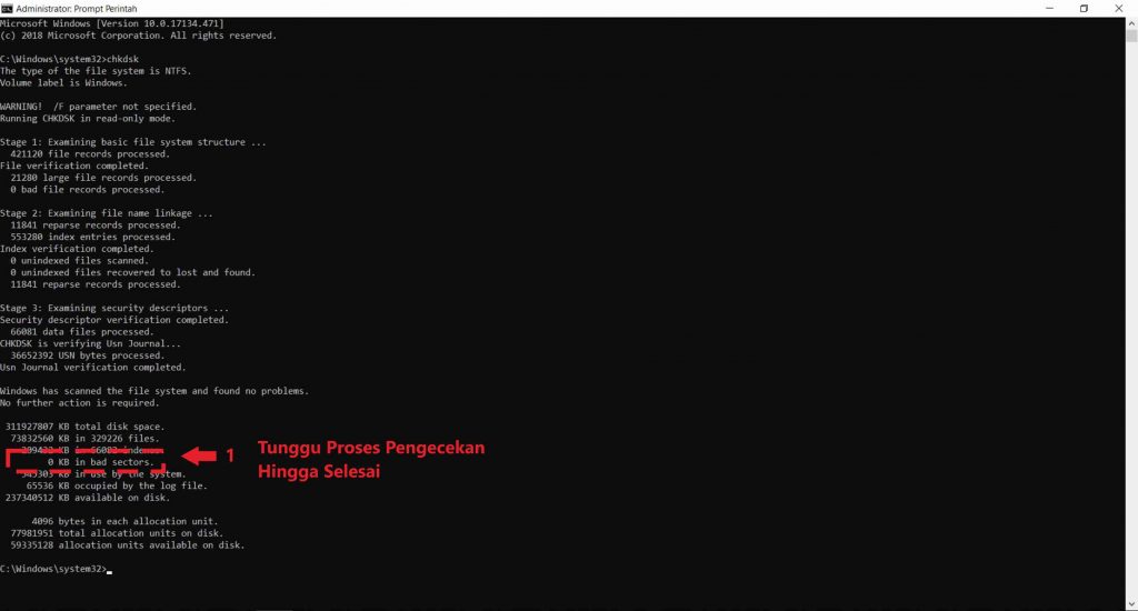 Catatan: Apabila terdapat 0 kb bad sector, itu menandakan bahwa kondisi hard disk masih dalam keadaan sehat dan tidak ada masalah. Namun apabila sudah terdapat 10 hingga 20 kb bad sector mengindikasikan mulai adanya masalah terhadap perangkat hard disk.