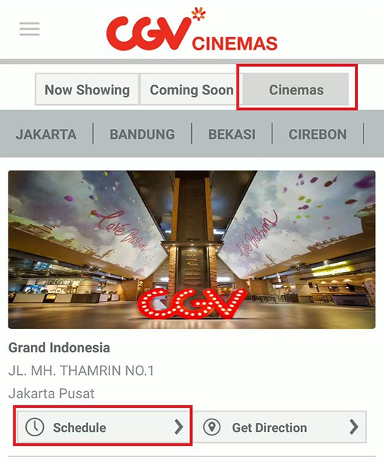 3. tap pada tab cinema lalu kamu cari lokasi CGV/Bioskop yang ingin kamu kunjungi, lalu tap pada tombol Schedule.