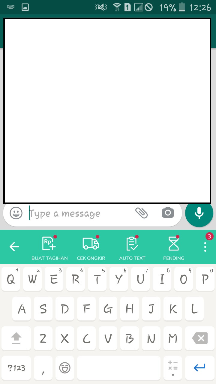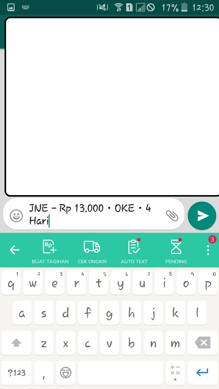 9. Cobalah beralih ke WhatsApp. Ini lah tampilan daripada keyboard Selly. Ada pilihan untuk membuat Tagihan, Cek Ongkir, Auto Text, Pending.