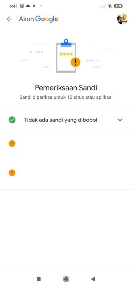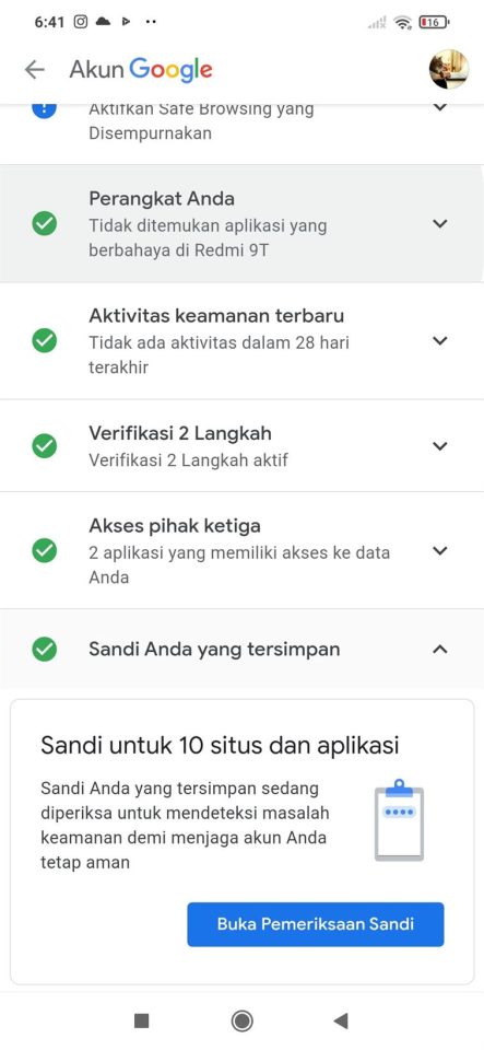 8. Setelah itu, proses pemeriksaan sandi akan berlangsung dan kamu hanya perlu menunggu. Dan inilah hasil pemeriksaan sandi dari akun penulis. Tanda hijau menandakan aman, sedangkan tanda kuning menandakan bahwa perlu perubahan kata sandi.