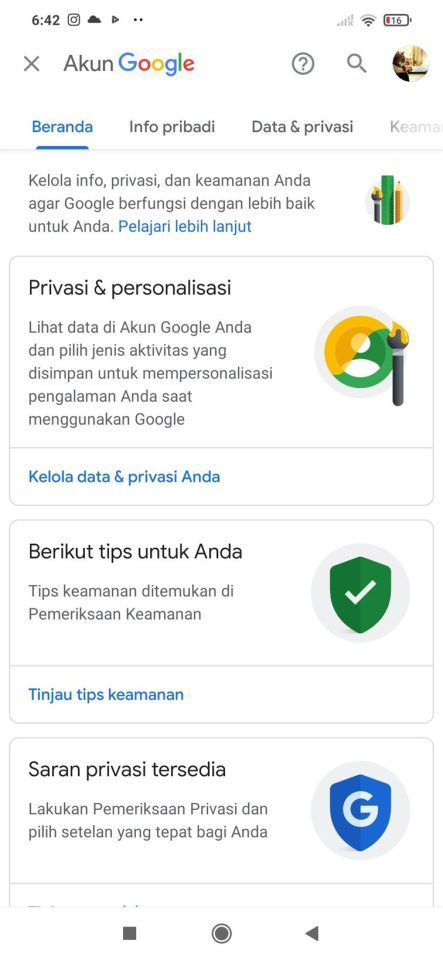 3. Selanjutnya pilih menu yang ada di dalamnya, yakni menu Kelola Akun Google Anda. Menu ini akan mengantarkan kamu pada preferensi akun Google yang lebih banyak. Kamu dapat melihat Info Pribadi, Data & Privasi, Keamanan dan lain-lain.