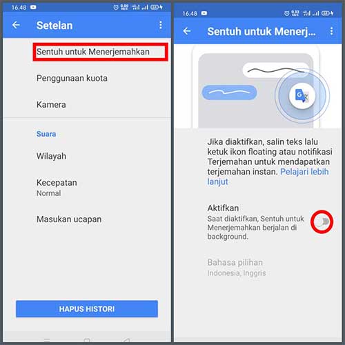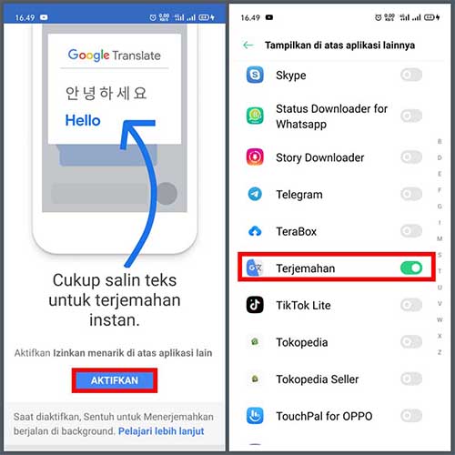 3. Tekan sekali lagi button aktifkan yang berwarna biru terus scroll ke bawah cari aplikasi penerjemah dan hidupkan.