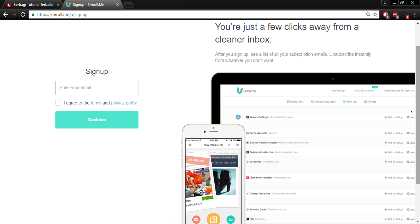 2. Selanjutnya Dengan cara kita mendaftar dulu atau membuat akun di unroll.me