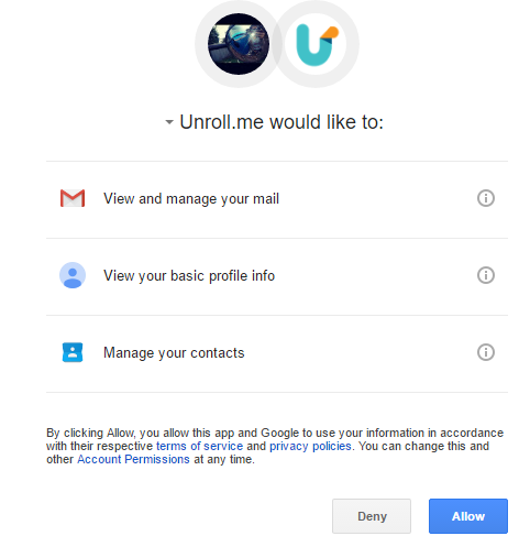 3. Selanjutnya unroll.me akan meminta kita agar mereka dapat mengakses email kita.