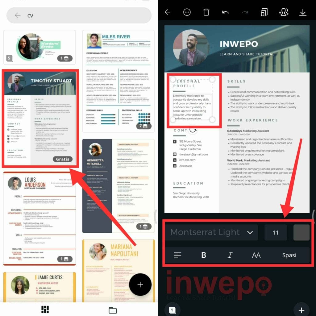 3. Pilih template CV yang akan kamu gunakan. Untuk mengganti teks yang ada kamu cukup mengetuknya 2x dan gunakan menu yang berada di bagian bawah untuk mengubah model font, ukuran dan lain-lain.