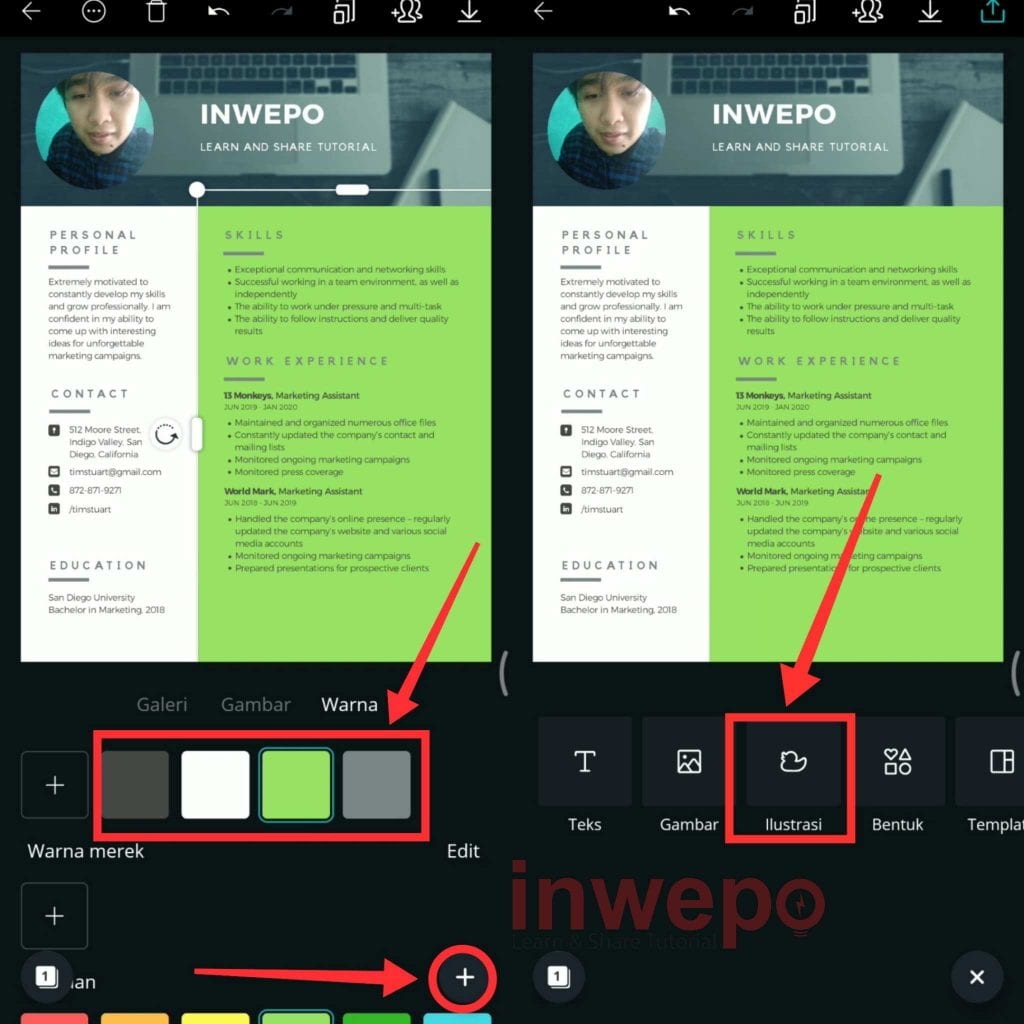 4. Untuk mengganti warna background cukup tap pada layar kosong di background lalu pilih menu warna dan pilih warna yang ingin kamu gunakan. Tap icon plus lalu pilih menu ilustrasi untuk menambahkan clip art.