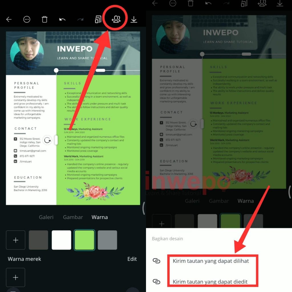 5. Tap icon people yang berada di bagian atas untuk membagikan link dari CV yang dibuat.