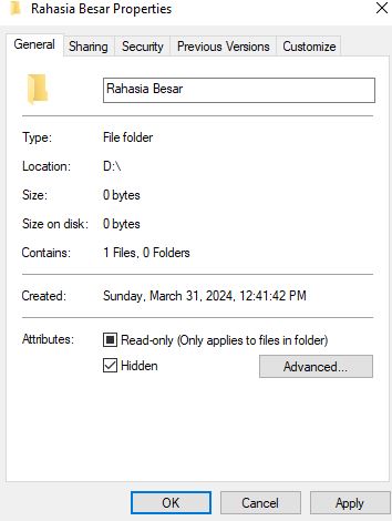 Dimulai dari melakukan klik kanan pada folder yang di dalamnya terdapat file yang ingin disembunyikan. Pilih properties, lalu di bagian tab General, tepatnya bagian Attributes, aktifkan opsi Hidden. Lalu, tekan Apply dan OK. Biasanya, mereka yang menggunakan fitur ini akan menempatkan terlebih dahulu folder nya di lokasi yang jarang dibuka.