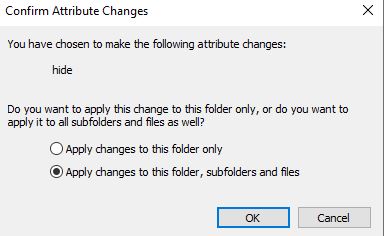 3. Di bagian jendela Confirm Attribute Changes yang muncul, pilih saja opsi Apply changes to this folder, subfolders and files. Opsi ini akan menjadikan file-file ataupun subfolder di dalamnya folder yang attribute-nya kita ubah, menjadi ikut tersembunyi.