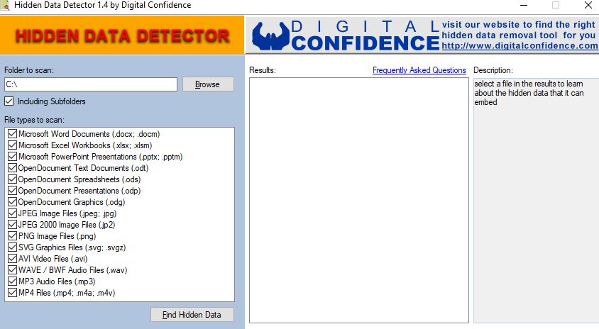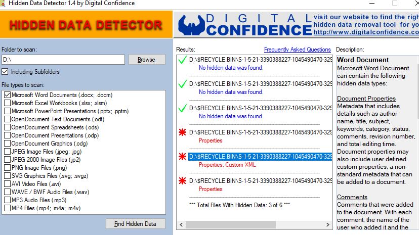 Aplikasi hidden data detector ini mendukung hampir seluruh jenis file extension yang ada. Aplikasi ini dapat mencari file tersembunyi extension-extension seperti; docx, xlsx, pptx, odt, ods, odp, odg, jpeg, png, svg, avi, wav, mp3, mp4 dan berbagai format lainnya. Wajar saja jika hidden data detector menjadi favorit banyak orang.