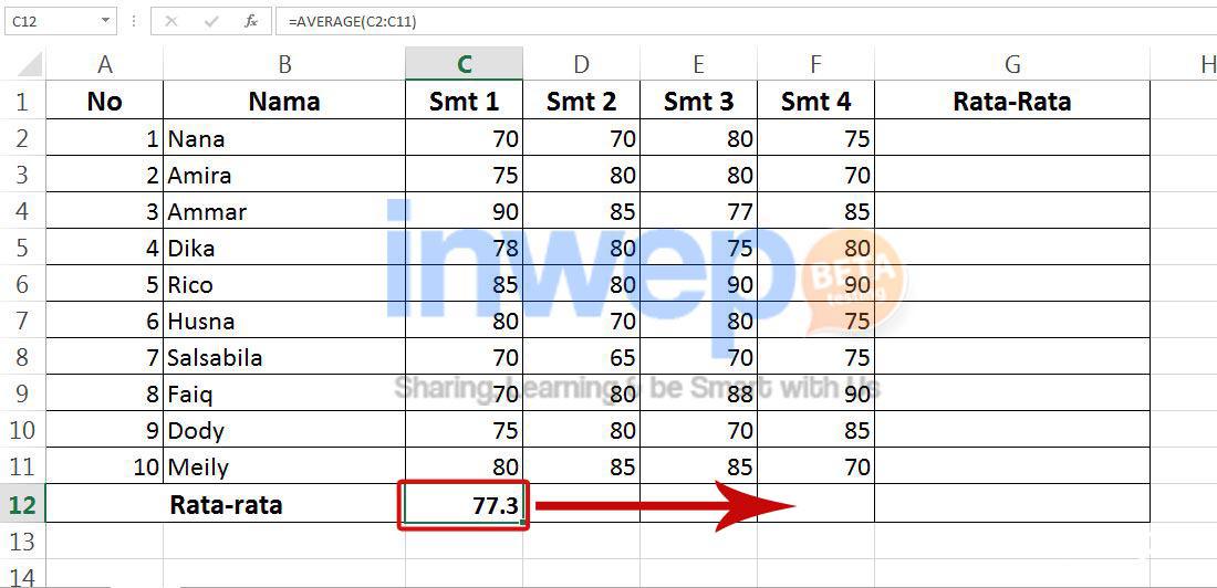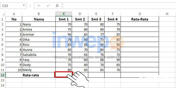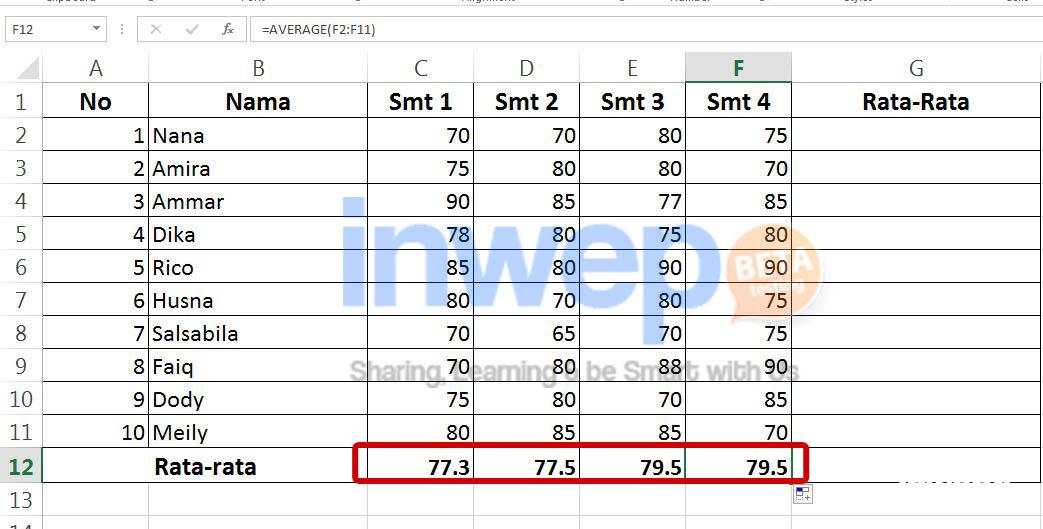 7. Letakkan kursor pada cell nilai rata-rata yg sudah didapat tadi.