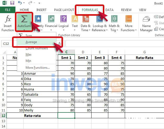 3. Klik menu bar “Formula” lalu klik “Auto Sum” dan pilih menu “Average” di dalamnya.