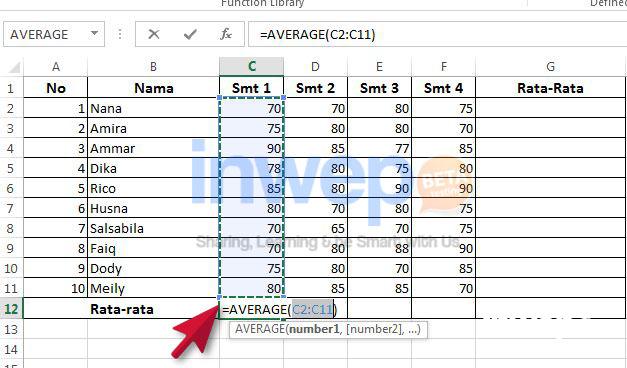 4. Secara otomatis formula average akan muncul pada cell tersebut. Seperti pada contoh yaitu, =AVERAGE(C2:C11).