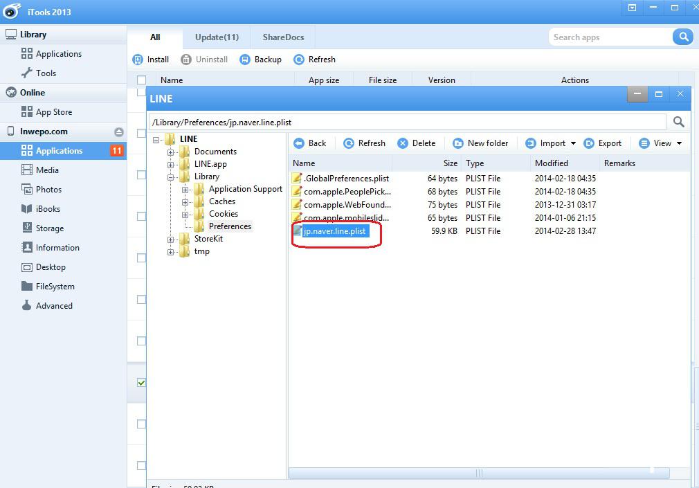 4. Masuk ke folder /Library/Preferences/ hapus file yang bernama jp.naver.line.plist dan hapus juga isi folder yang berada di /Library/Cookies/
