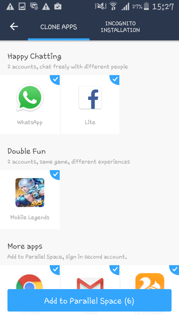 Catatan: Aplikasi ini hanya dapat mengkloning aplikasi kamu sekali. Artinya hanya ada dua aplikasi yang sama di Smartphone kamu.