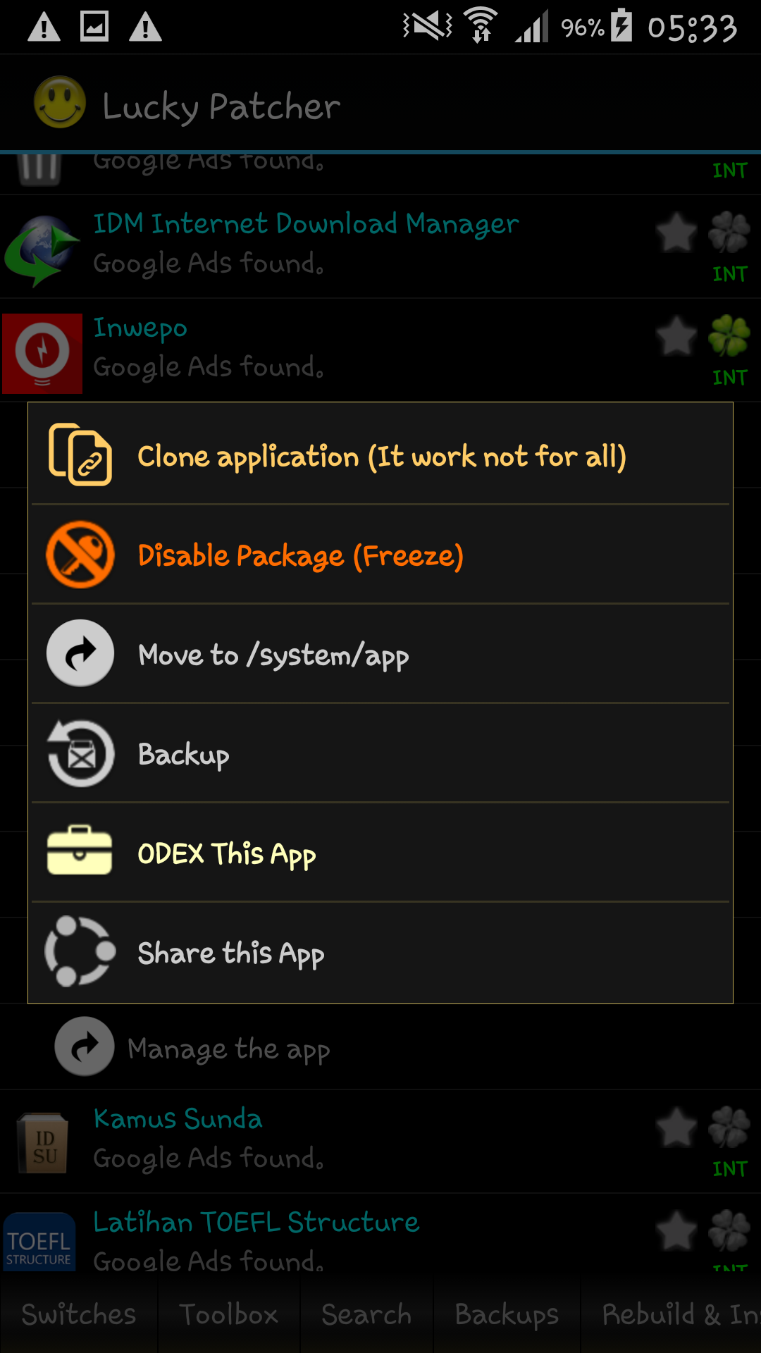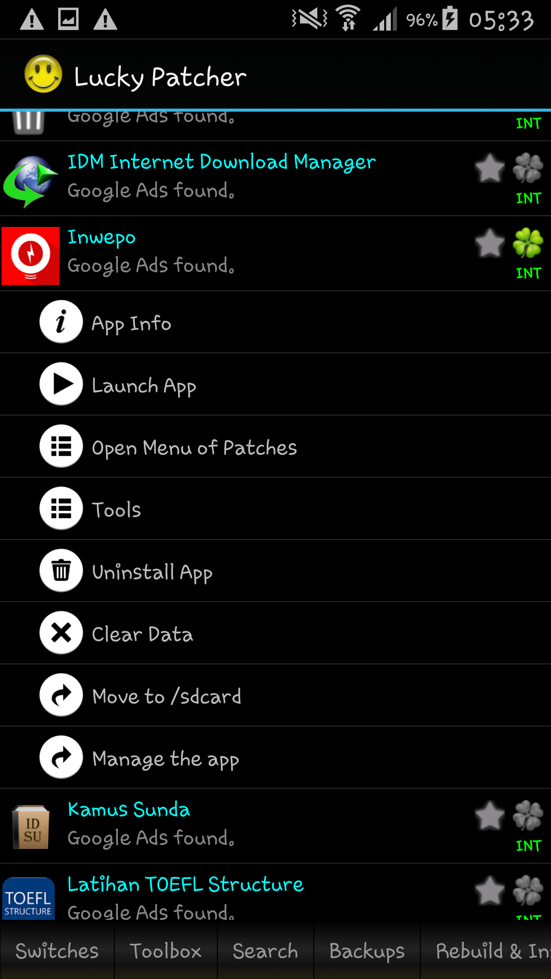 Ketika kalian membuka Lucky P4tcher, kalian akan melihat daftar lengkap berisi semua aplikasi yang telah terpasang di perangkat kalian. Kalian hanya perlu mengetuk salah satu aplikasi untuk melihat pilihan yang tersedia seperti melihat info aplikasi, mencopot, menghapus data tambahan dan mengakses peralatan khusus lainnya.