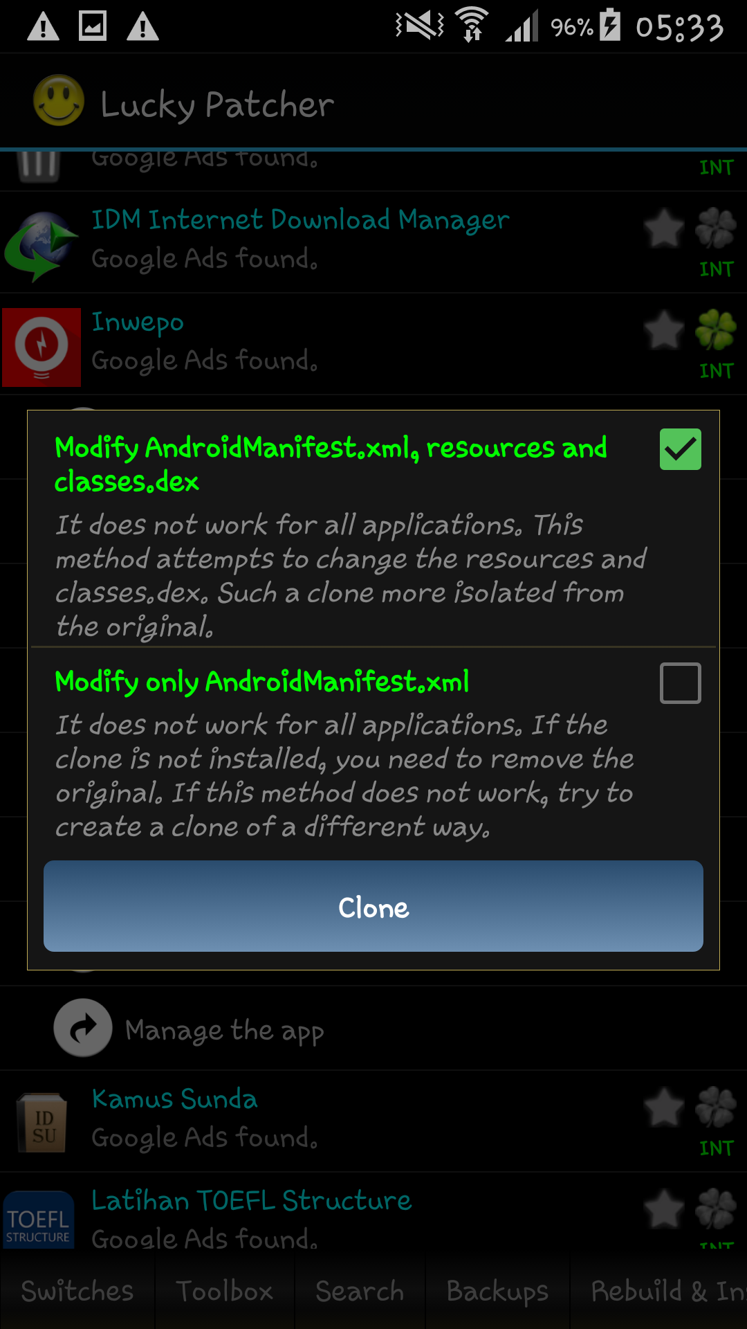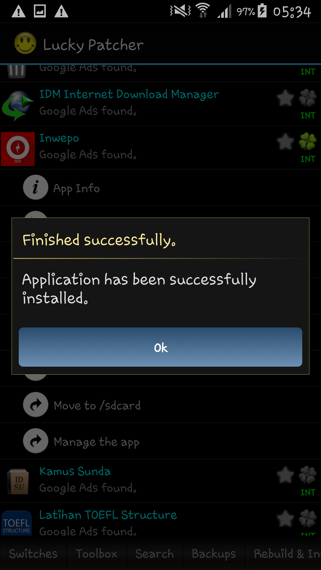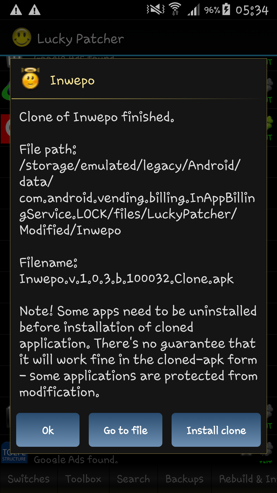 8. Setelah selesai, tap “Ok” dan silahkan keluar dari aplikasi Lucky P4tcher untuk melihat apakah sudah ada atau tidak hasil kloningan aplikasi tersebut.