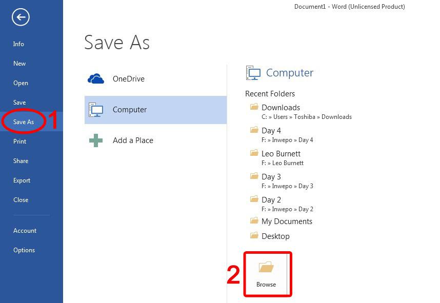 Pada saat menyimpan dokumen, pilih “Save As” dan cari dahulu tujuan penyimpanan dokumennya.