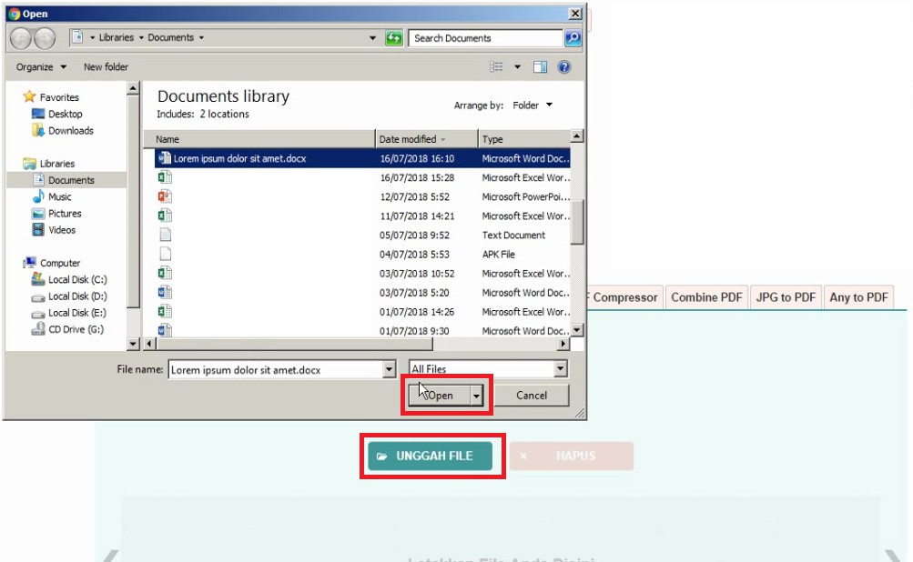 2. Lalu kamu klik tombol upload dan pilih berkas Ms. Word yang ingin kamu ubah menjadi format gambar.