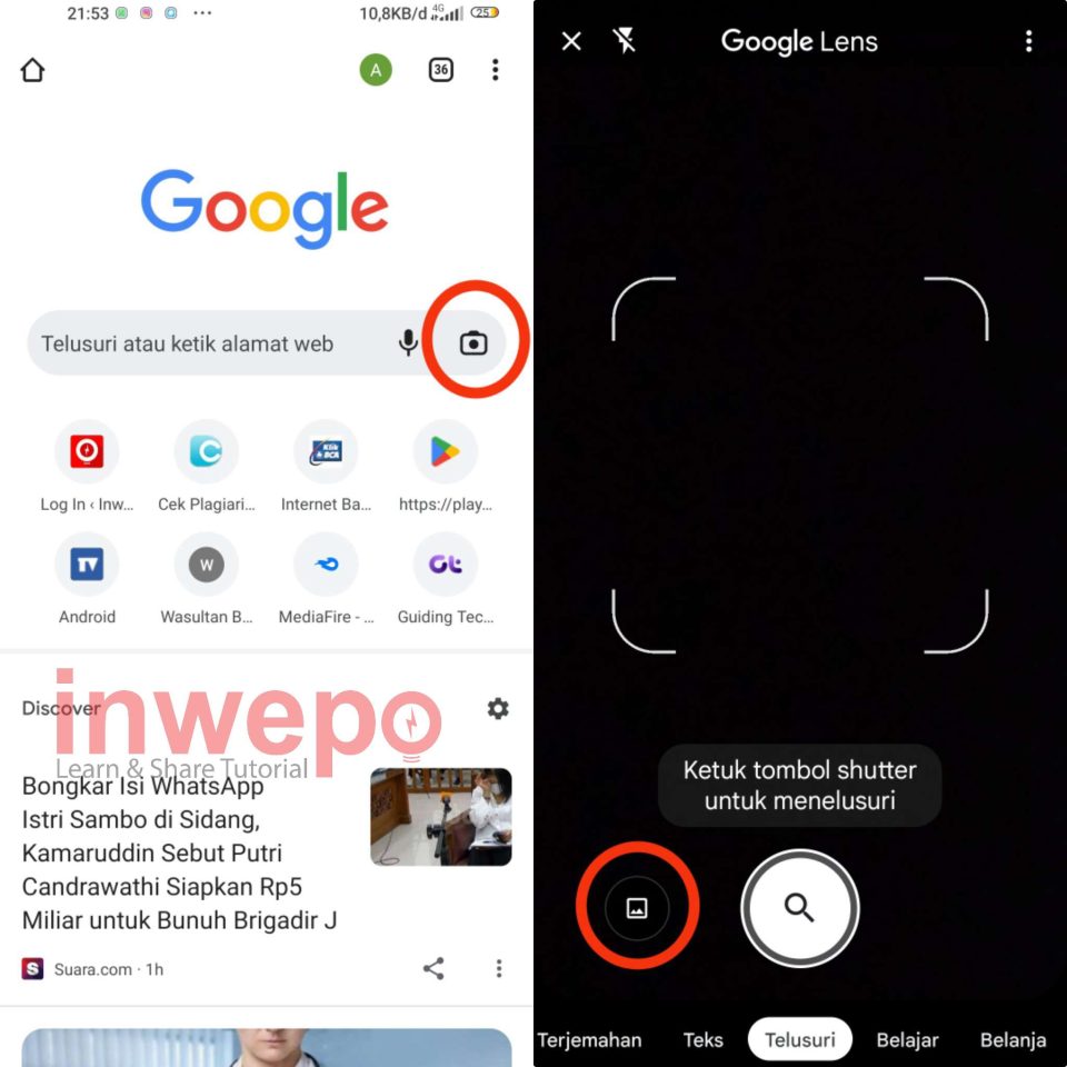 2. Buka aplikasi Google Chrome lalu tap pada icon kamera. Setelah masuk ke menu Google Lens tap icon picture untuk menambahkan file screenshot.