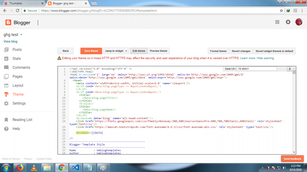 7. Tekan CTRL + F di bagian kode script. Ketikkan <b:skin> di kolom teks, kemudian tekan Enter.