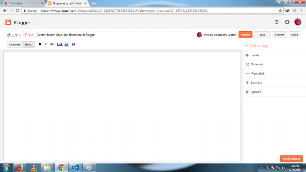 12. Ketikkan judul posting adalah “Contoh Button Style dari Bootstrap di Blogger”.