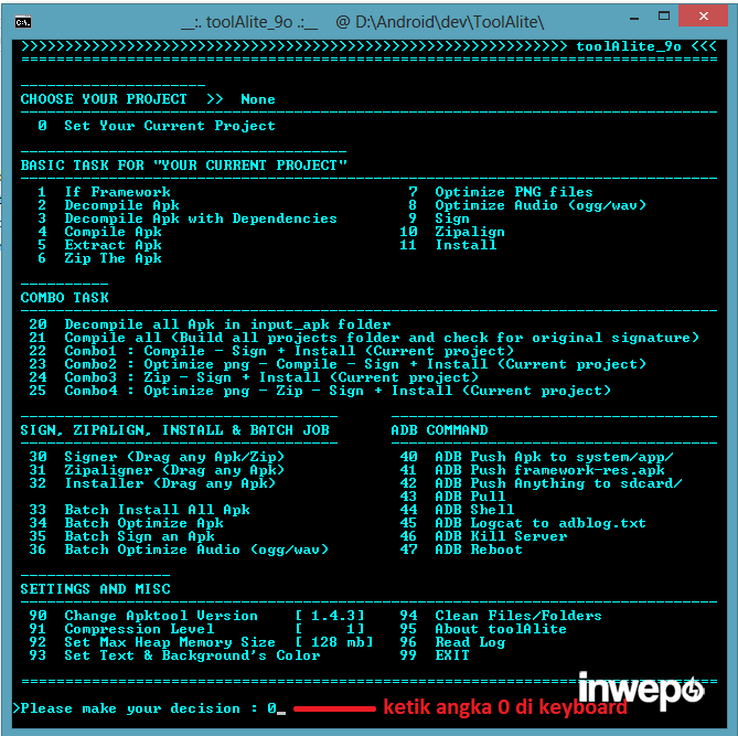 4. Setelah masuk ke dalam menu tekan angka 0 untuk set your current project , enter.