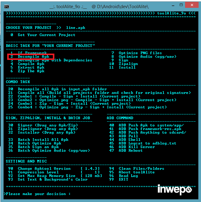 6. Setelah di set APK-nya kemudian pilih dan masukan angka 2 dan enter untuk Decompile APK.
