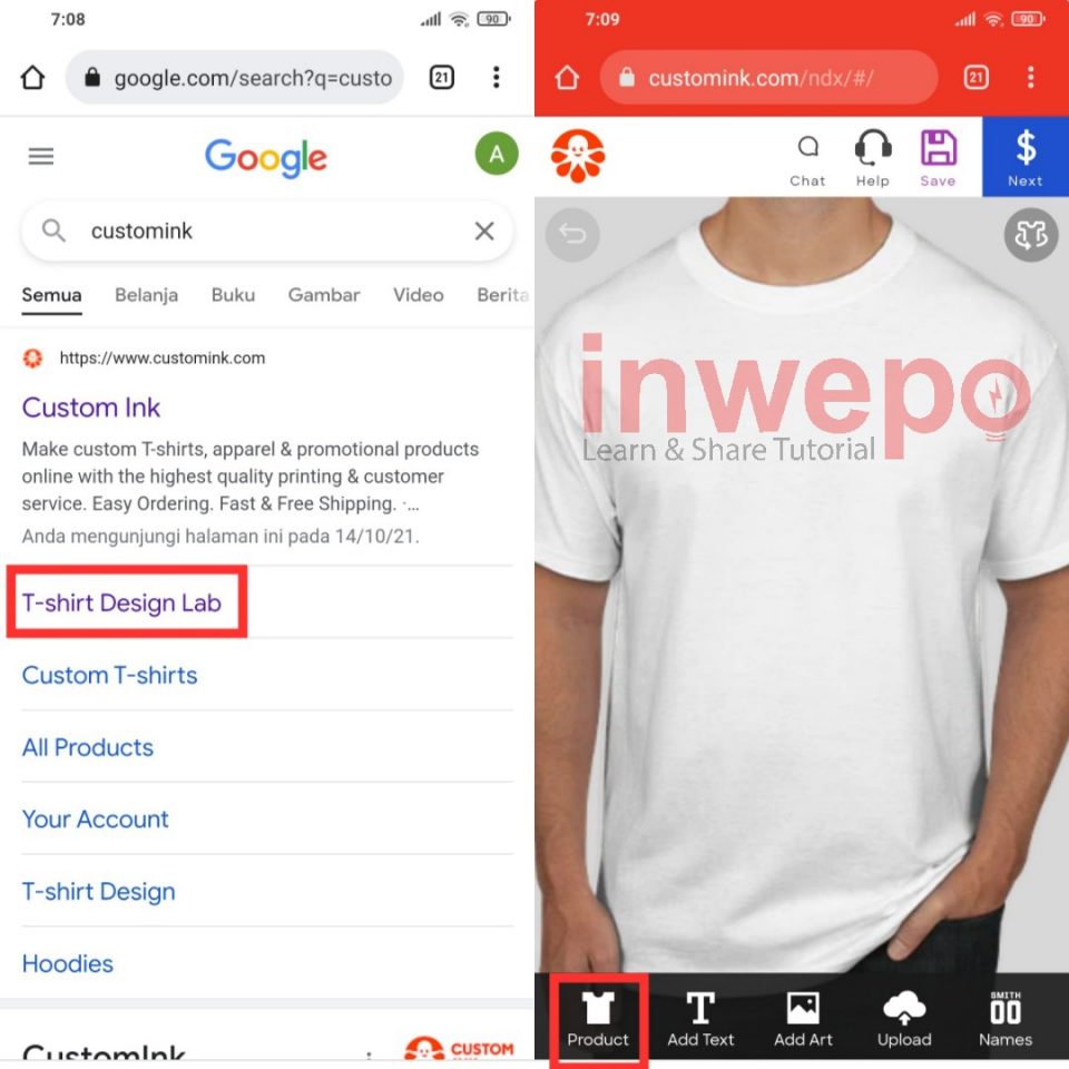 1. Buka aplikasi browser milik kamu, selanjutnya pada kolom pencarian ketikan custom ink. Pilih menu T-Shirt Design Lab, untuk mengganti model baju atau kaos kamu bisa pilih menu product.