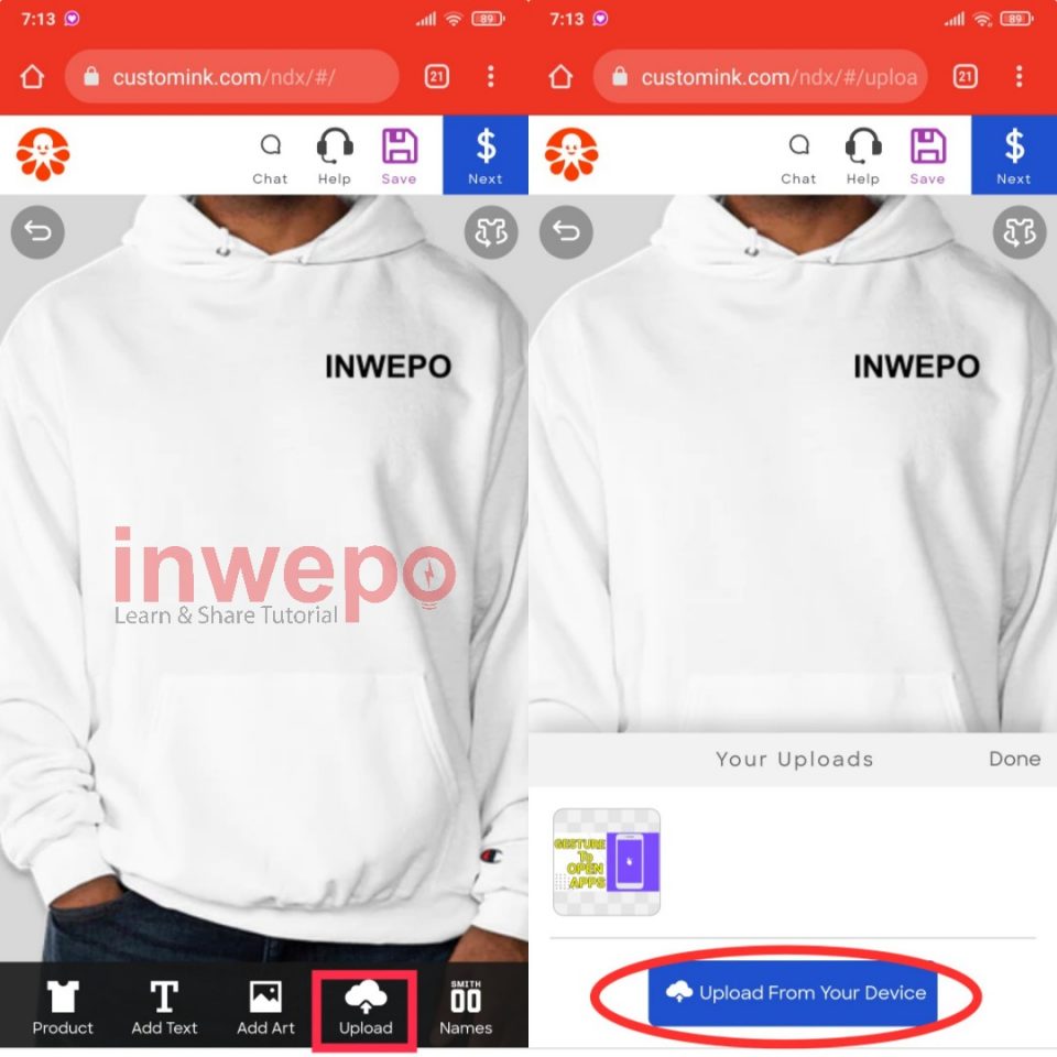 6. Untuk memasukkan gambar milik mu sendiri, tap pada menu Upload. Lalu pilih Upload from device.