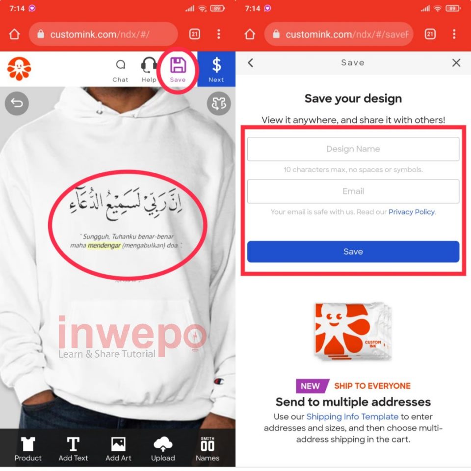 7. Terakhir tap menu Save dibagian atas untuk menyimpan design kaos mu. Tambahkan nama design kamu lalu email kamu yang aktif. Terakhir ketuk Save dan design akan di kirimkan ke alamat email kamu.