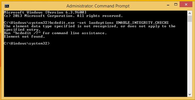bcdedit.exe -set loadoptions DDISABLE_INTEGRITY_CHECKS
