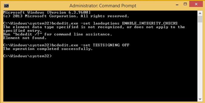 bcdedit.exe -set loadoptions ENABLE_INTEGRITY_CHECKS
