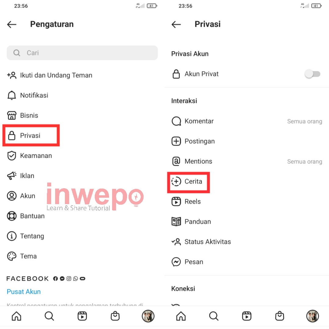 2. Pilih menu Privasi kemudian pilih menu Cerita.