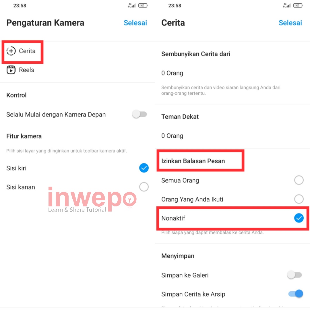 4. Sama seperti sebelumnya tap menu Cerita lalu pilih lagi nonaktif pada menu Izinkan balasan pesan.