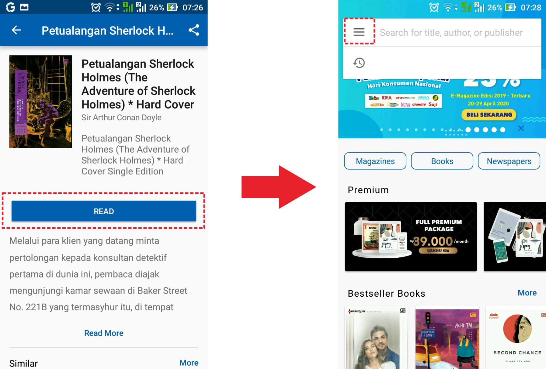 4. Jika proses mengunduh sudah selesai, klik read. Maka kita akan langsung dapat membaca buku tersebut. Selain itu secara otomatis buku akan tersimpan di koleksi. Untuk mengeceknya, klik logo “tiga strip” di bagian pojok kiri.