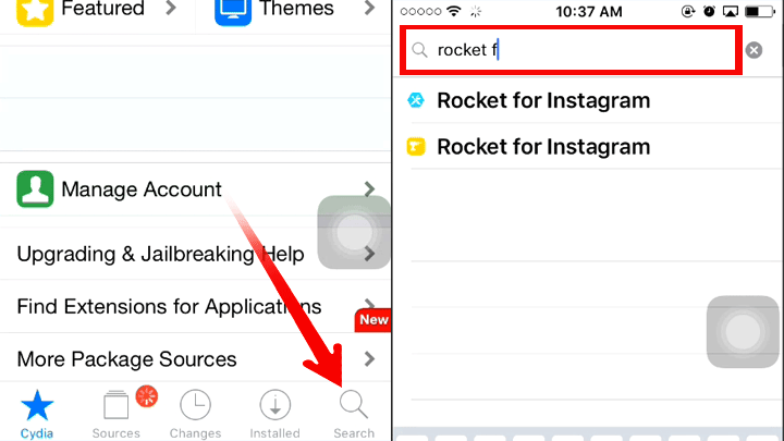 1. Buka Cydia – pilih menu search – ketik “Rocket For Instagram” di kotak pencarian.
